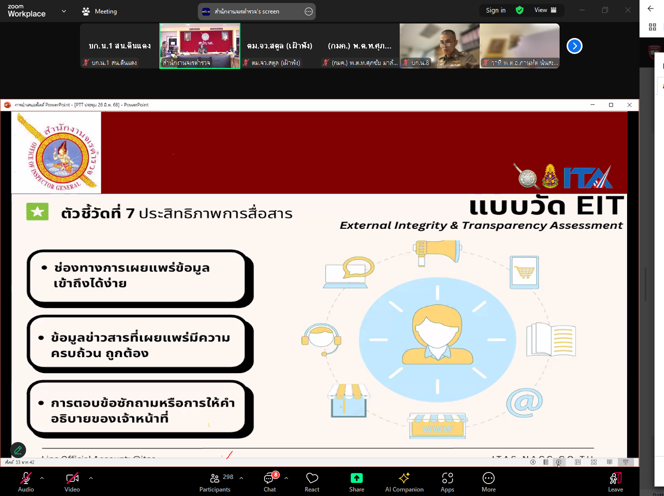 เมื่อวันที่ 26 มีนาคมคม 2568 เวลา 10.00 น. พ.ต.อ.ภษิต กะเตื้องงาน ผกก.สน.ดินแดง เรียกกรรมการกำกับติดตามและดูแลงานการประเมินคุณธรรมและความโปร่งใสในการดำเนินงานของหน่วยงานภาครัฐ (ITA) และคณะทำงาน เข้าร่วมประชุมผ่านระบบ ZOOM Meeting ตามหนังสือสั่งการ เพื่อเร่งรัดและติดตามการดำเนินการเพื่อขับเคลื่อนให้การประเมิน ITA ของ ตร. และระดับสถานีตำรวจ ในปีงบประมาณ 2568 เป็นไปด้วยความเรียบร้อย